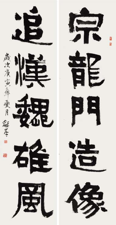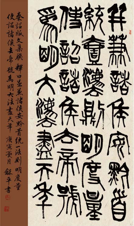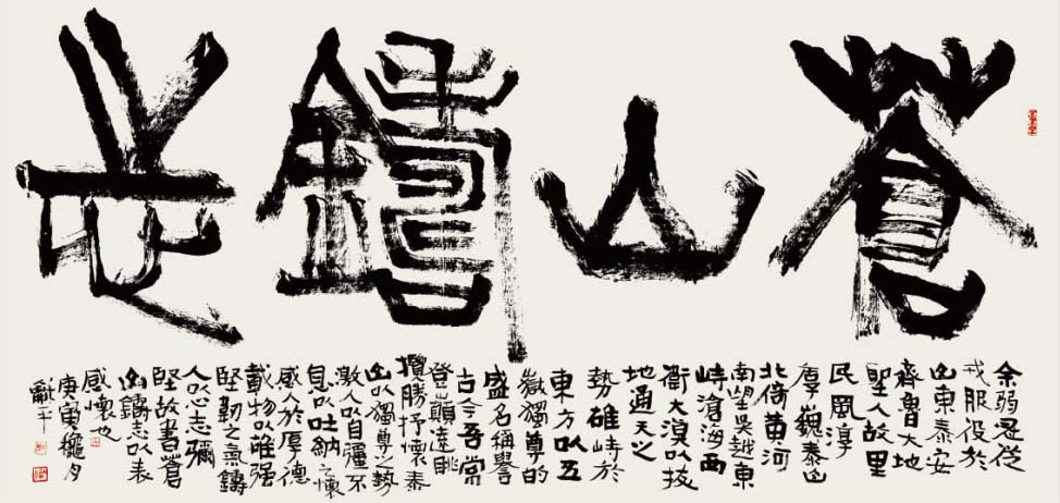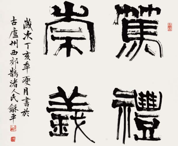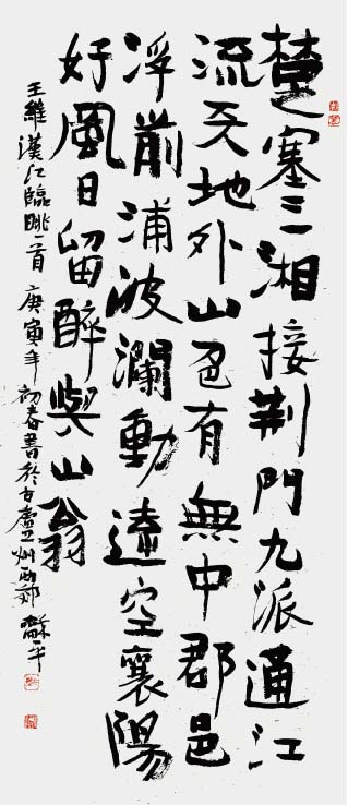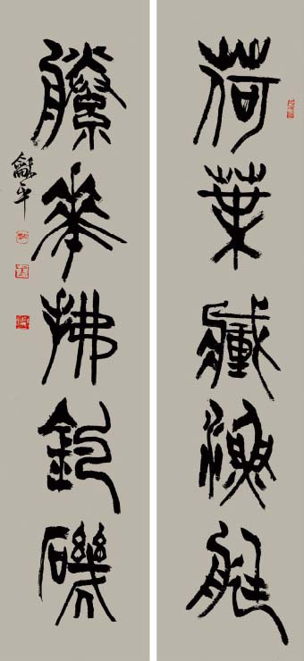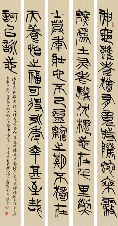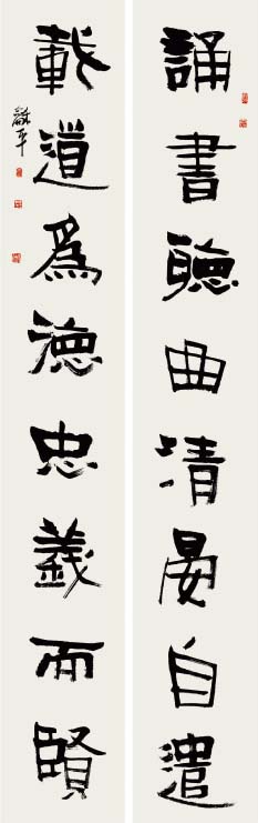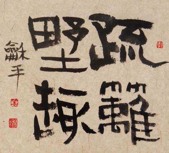 学书自唐楷入,初以《九成宫》为日暮途穷课,以奠其基;继而转习汉隶。曾潜心研摩《华山》、《史晨》、《张迁》、《乙瑛》、《石门》诸碑,以求其古朴之韵;随之浸淫魏碑,临习《张猛龙》、《郑文公》、《汝南王》、《张黑女》等,以得其雄厚之力;后曾涉于金文、籀篆、沉酣于《散氏盘》、《石鼓文》,以溯其源;近期主攻二王行草,取其自然飘逸、悠闲淡雅之态。书风力追雄强险劲之气势,朴拙自然之意趣。